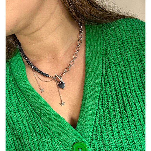 Unikalus rankų darbo vėrinys, pagamintas pusiau iš natūralių hematito akmenėlių, o kita dalis – elegantiška nerūdijančio plieno grandinėlė. Šis papuošalas segamas per priekį, todėl patogus nešioti ir tampa stilingu akcentu kiekvienoje aprangoje. Priekyje vėrinį puošia subtilus širdelės formos pakabukas – romantiška, tačiau neperkrauta detalė, tinkanti tiek kasdienai, tiek ypatingoms progoms. Papildomos įterptos grandinėlės suteikia papuošalui išskirtinumo ir modernumo pojūtį. Vėrinys puikiai derės prie minimalistinio stiliaus ir galima nešioti vieną, kaip vienintelį ryškų akcentą. Vėrinio ilgis apie 42 cm.